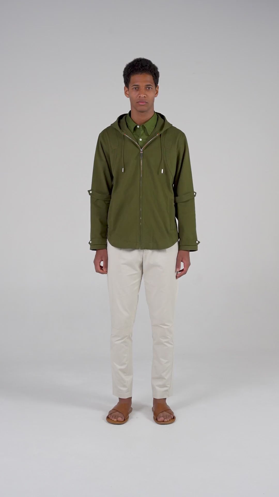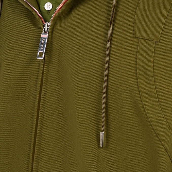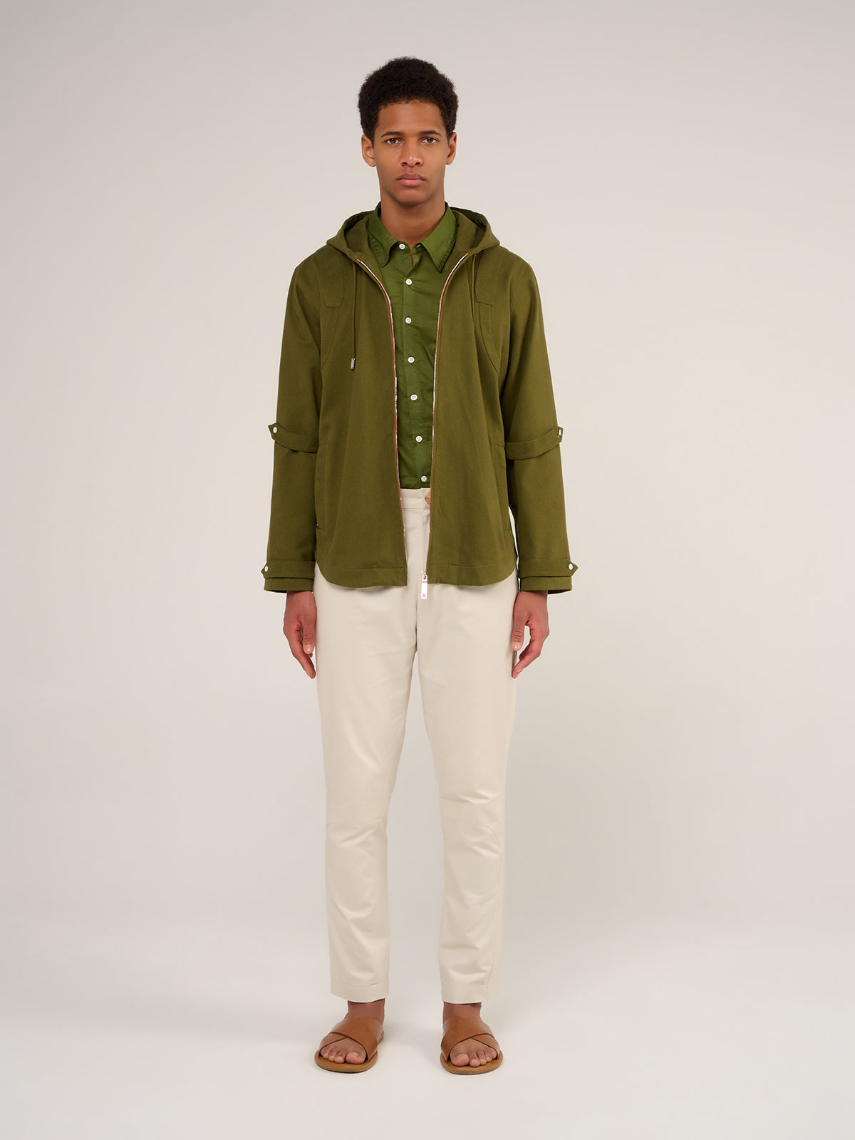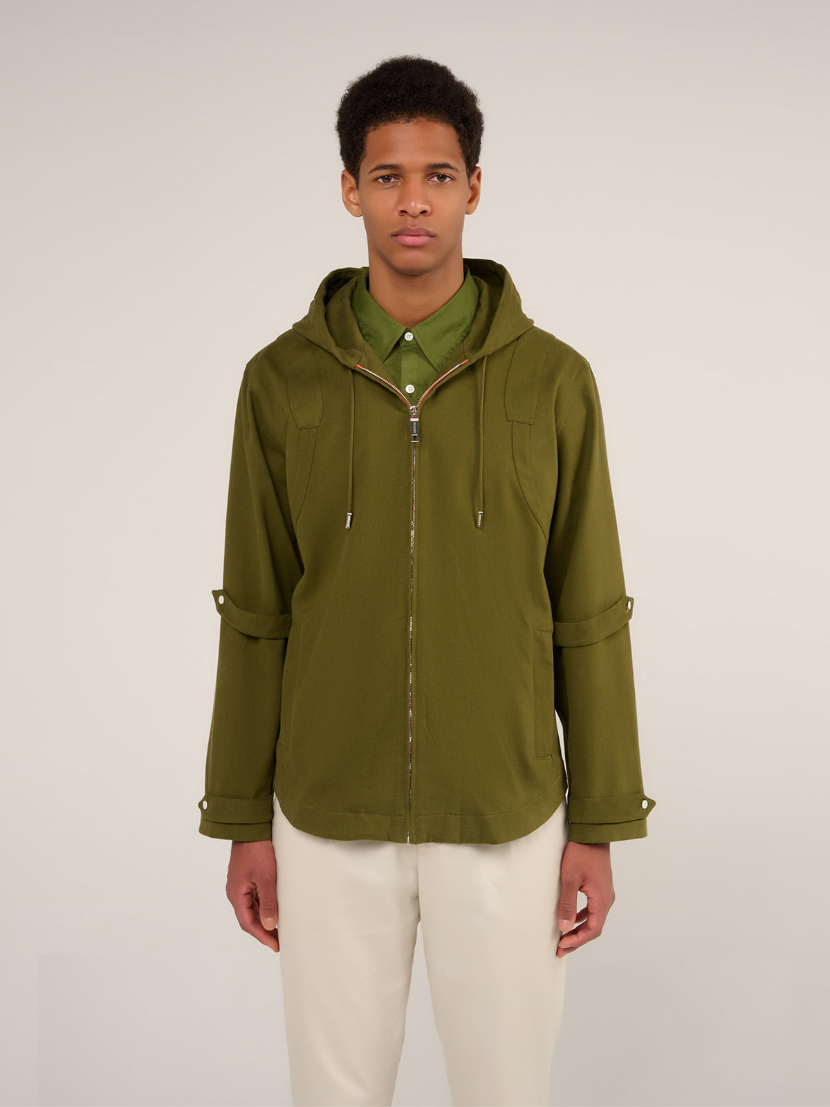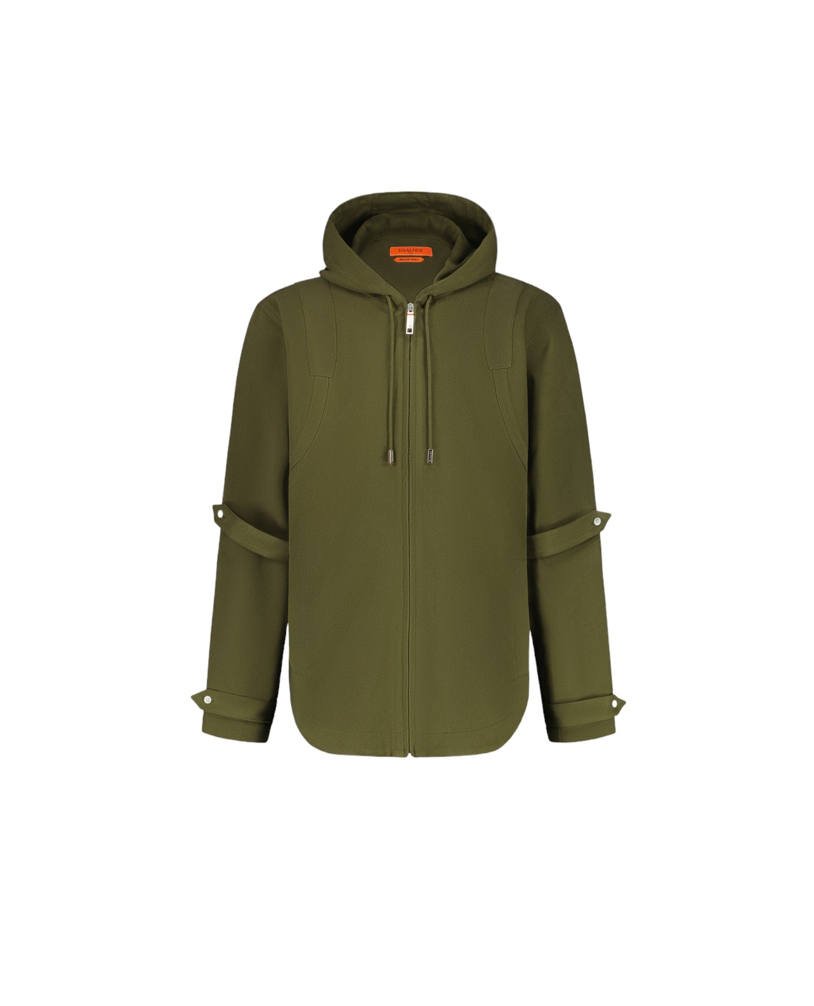 Discover the Nikki hooded tunic, made in khaki cotton. This piece is characterized by its patch inserts on the chest and back, its side pockets with zip closure, as well as its tightening tabs at the elbows and cuffs, which offer a silhouette full of character. It closes at the front with a zip and can be worn closed to highlight its slim fit, or open over one of our signature Baalder t-shirts.