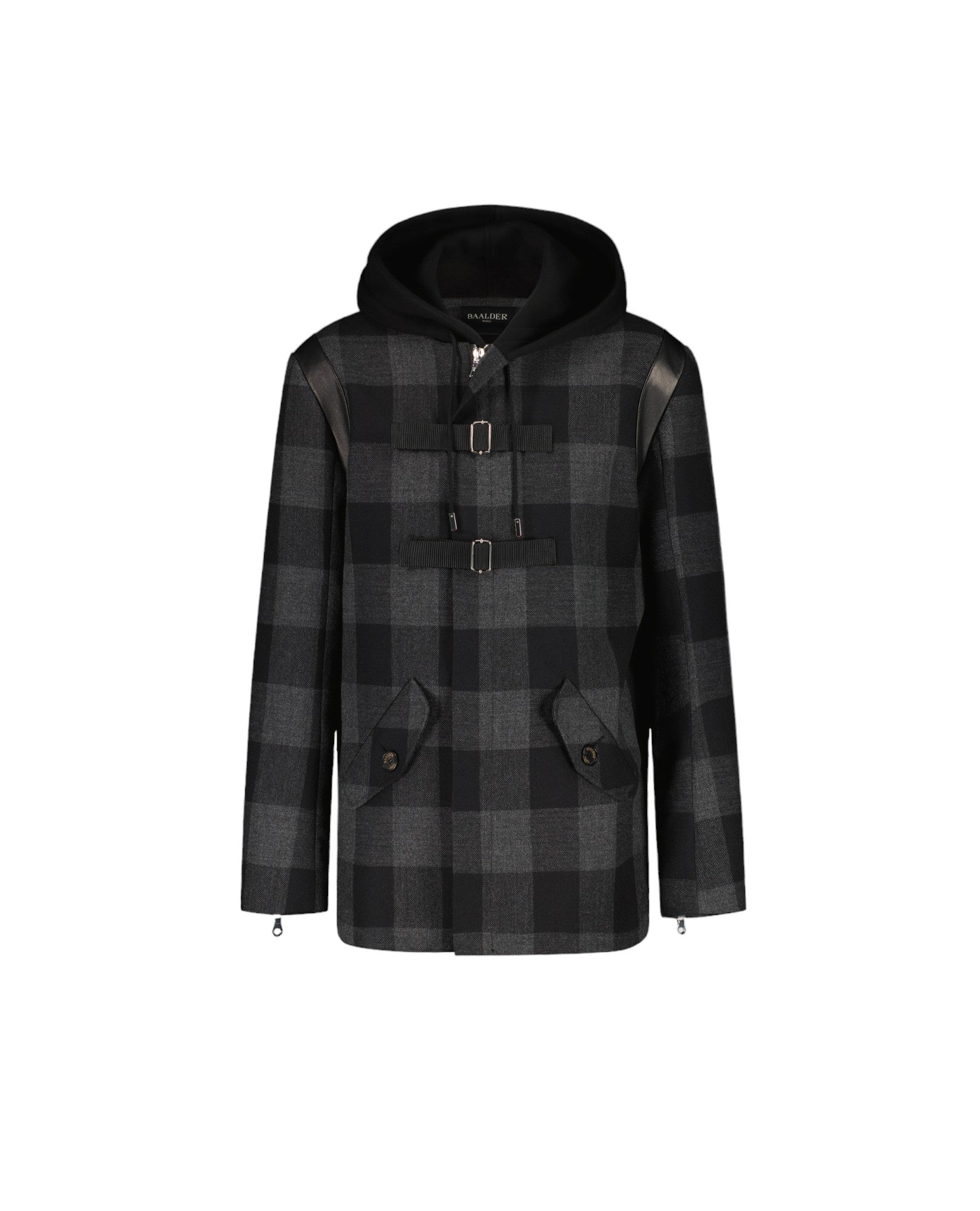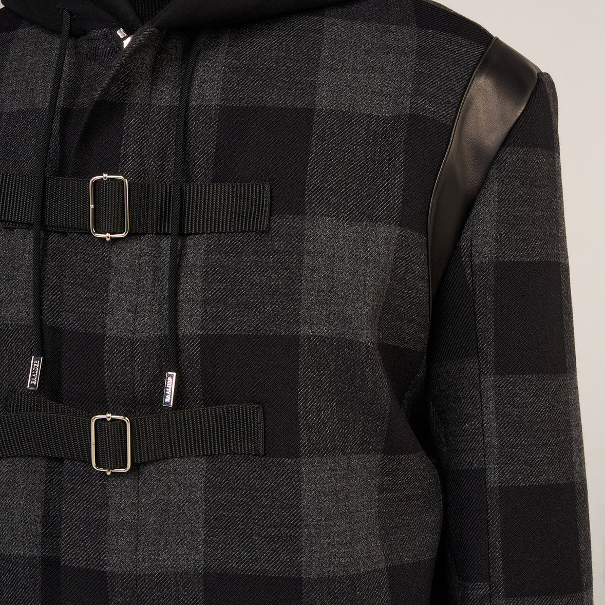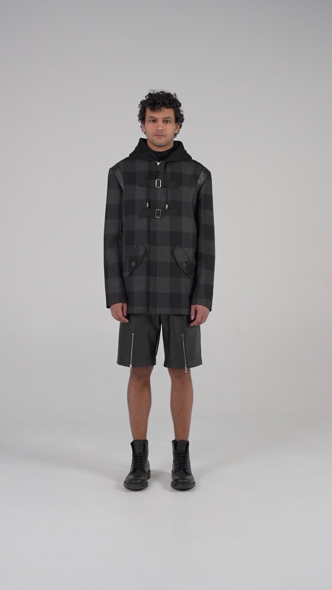 Italian wool with gray and black tartan pattern, superior quality. Integrated neoprene hood. Braided Japanese cord.