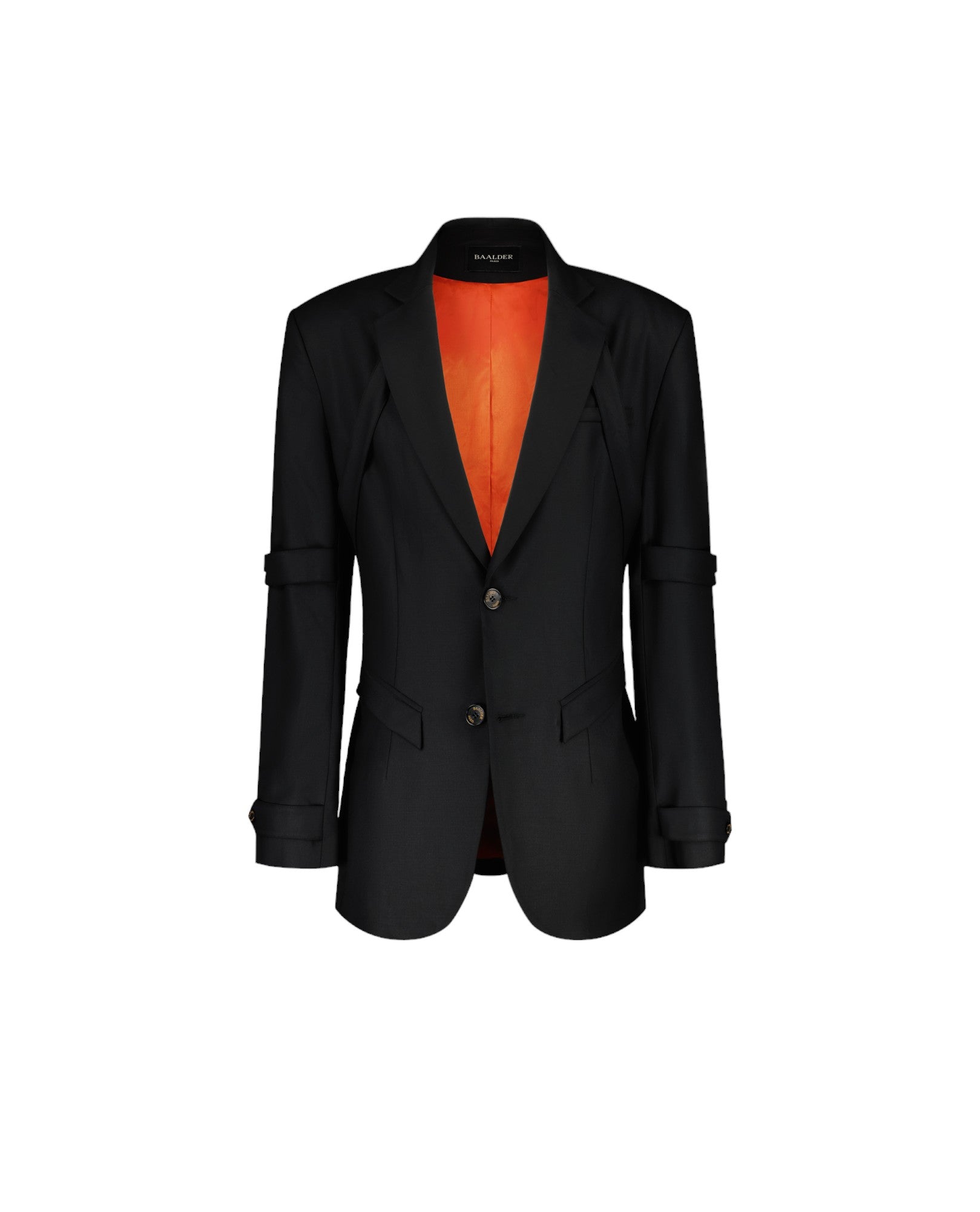 Poches à rabat orientées vers l'intérieur, pâtes de serrage aux bras, empiècements croisé dans le dos, boutons en corne véritable gravés Baalder.
